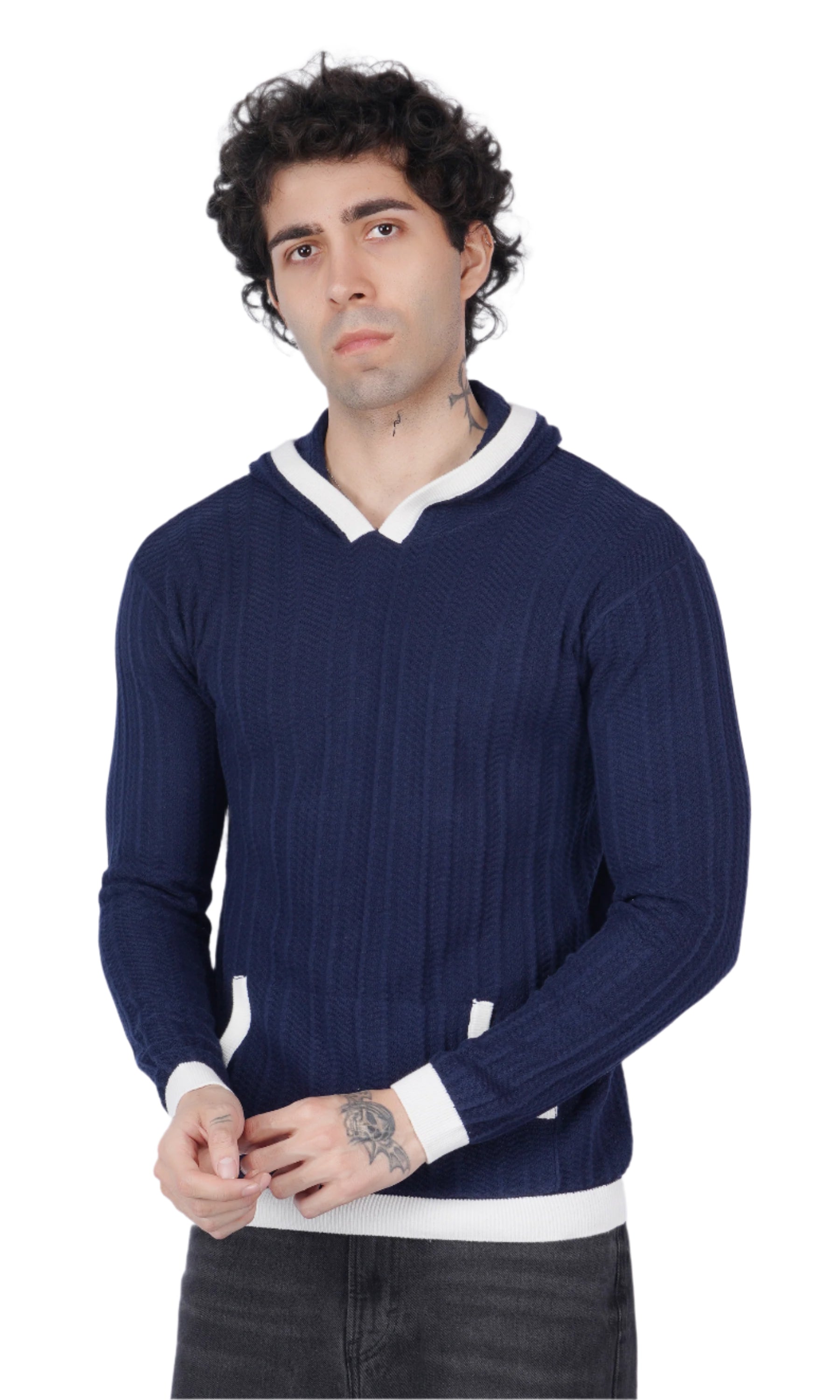 The INFAXON Navy Blue and White Knitted Hoodie features a sleek color-block design, combining navy blue and white for a stylish, modern look. Made from soft, knitted fabric, this hoodie offers warmth and comfort with a relaxed fit that’s perfect for casual wear. Ideal for layering or wearing on its own, it adds a touch of effortless style to your everyday outfits.