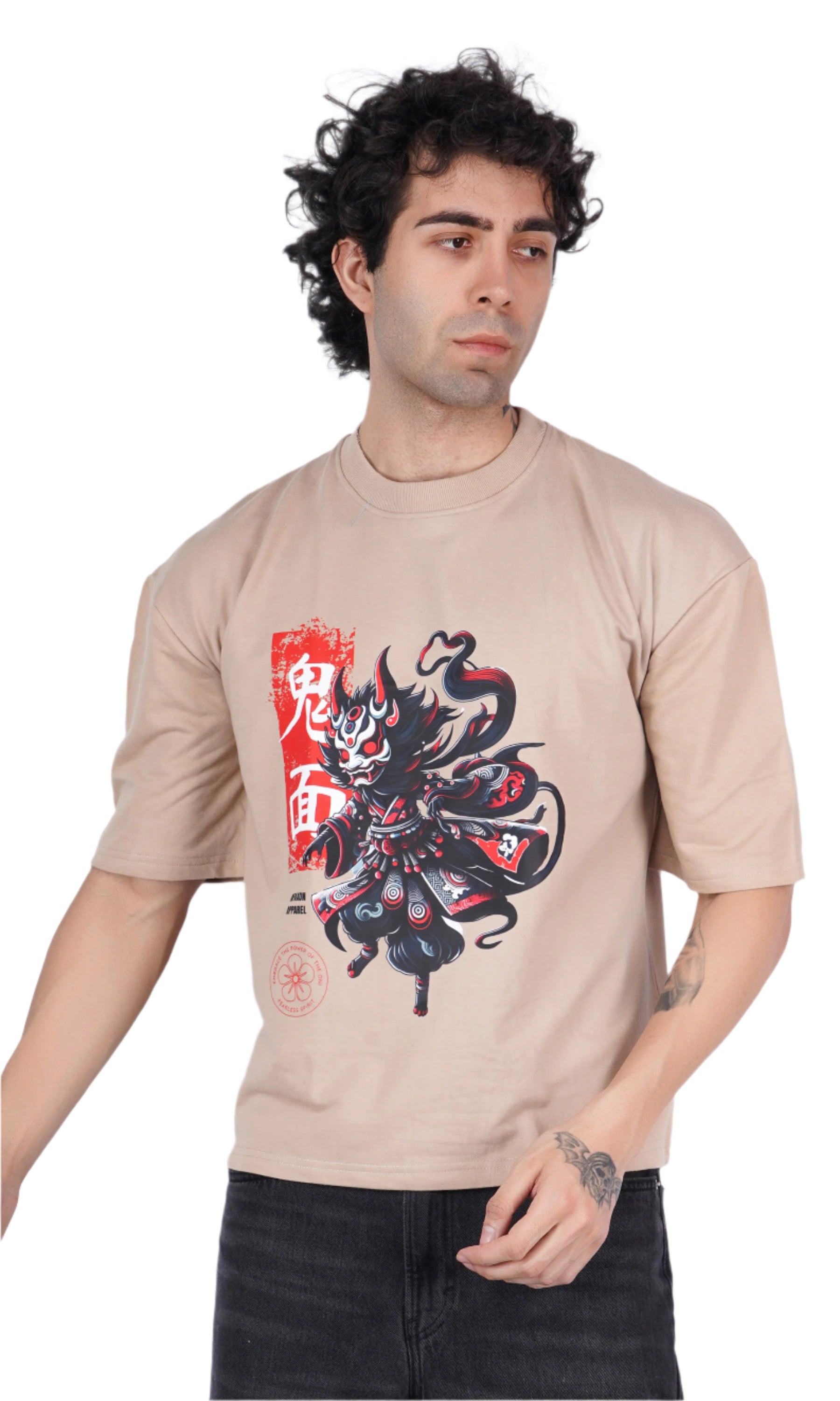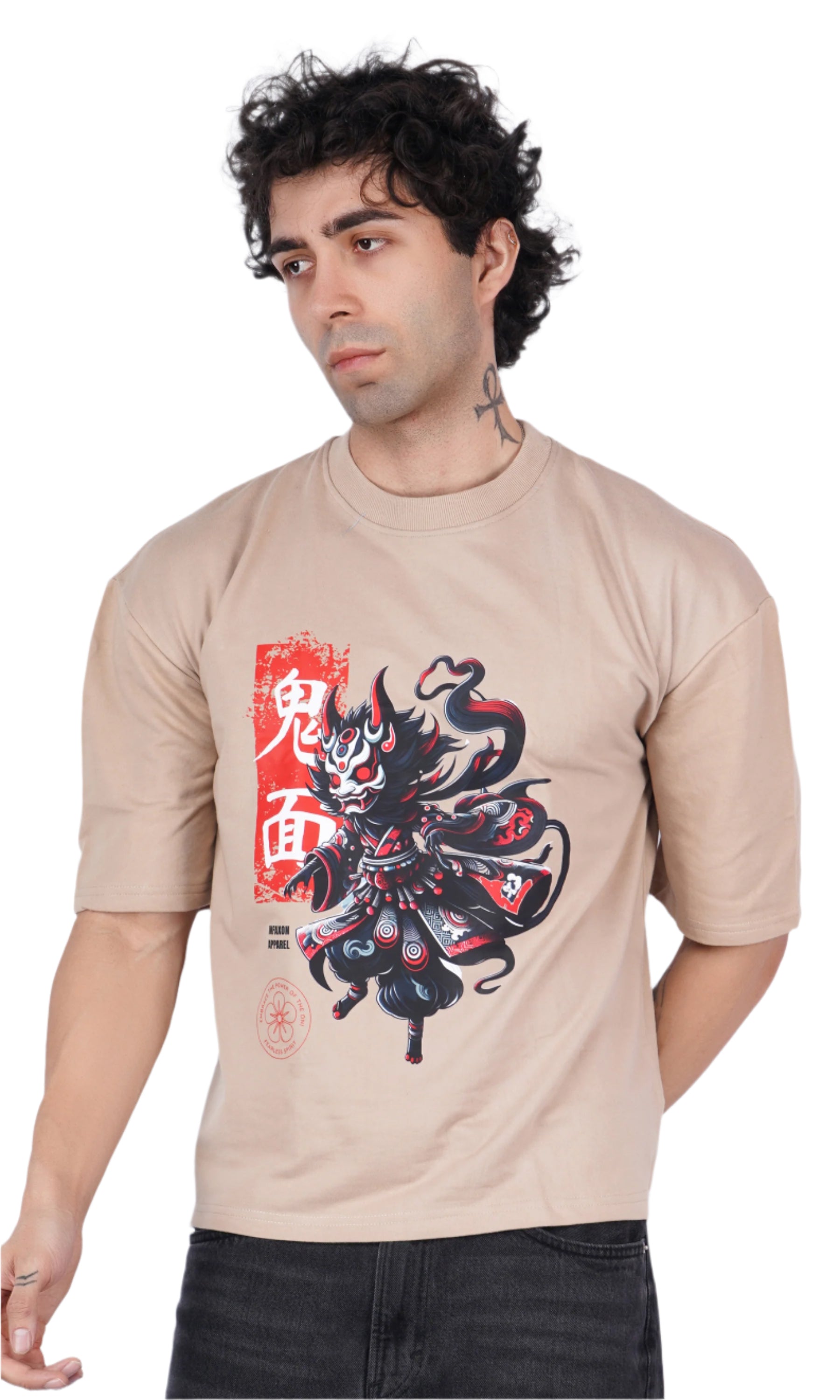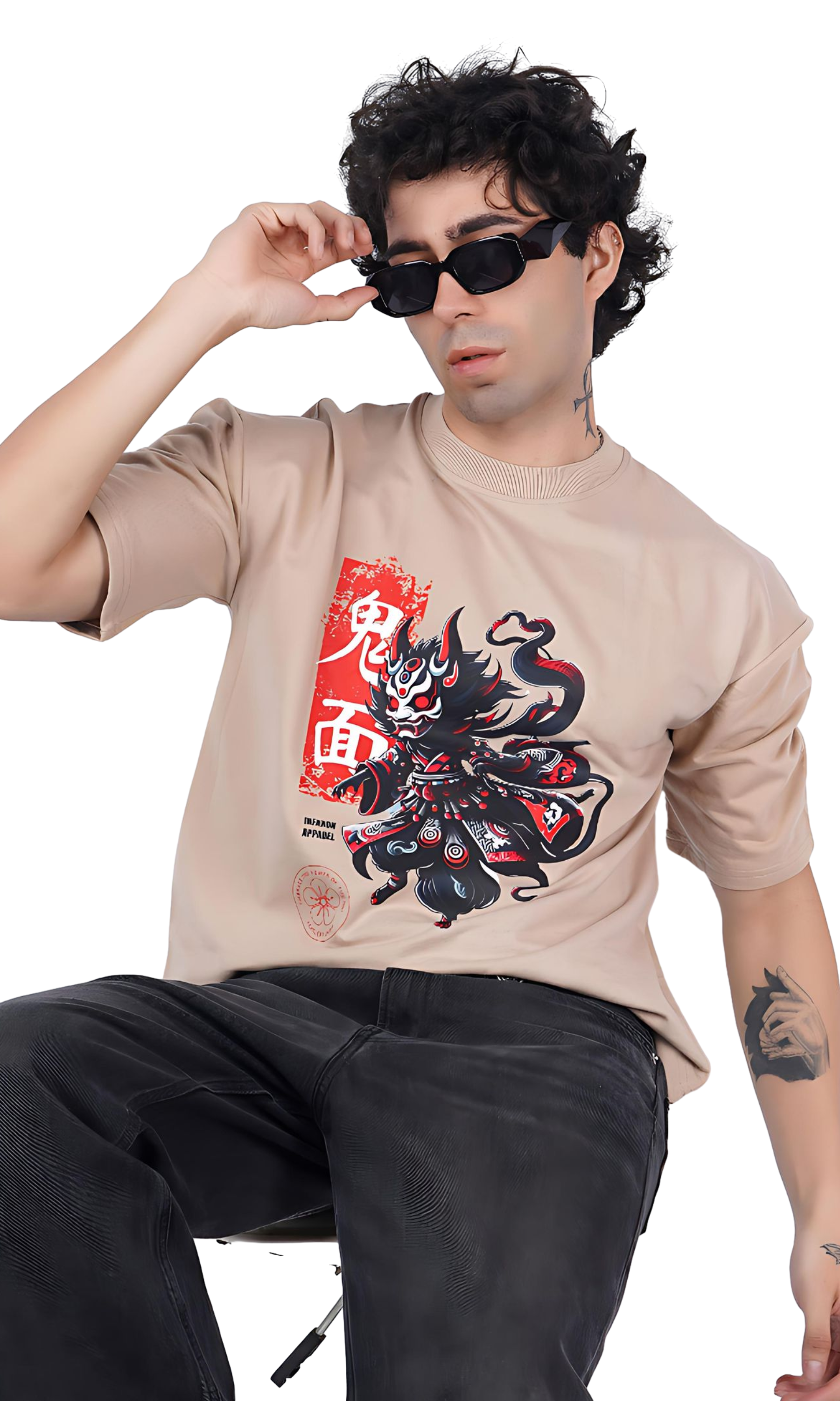 The INFAXON Oni Beige Oversize T-shirt features a bold "Oni" graphic, inspired by Japanese culture. Made from soft cotton, this relaxed-fit tee in a neutral beige color offers both comfort and style, making it perfect for casual wear with a unique, standout design.