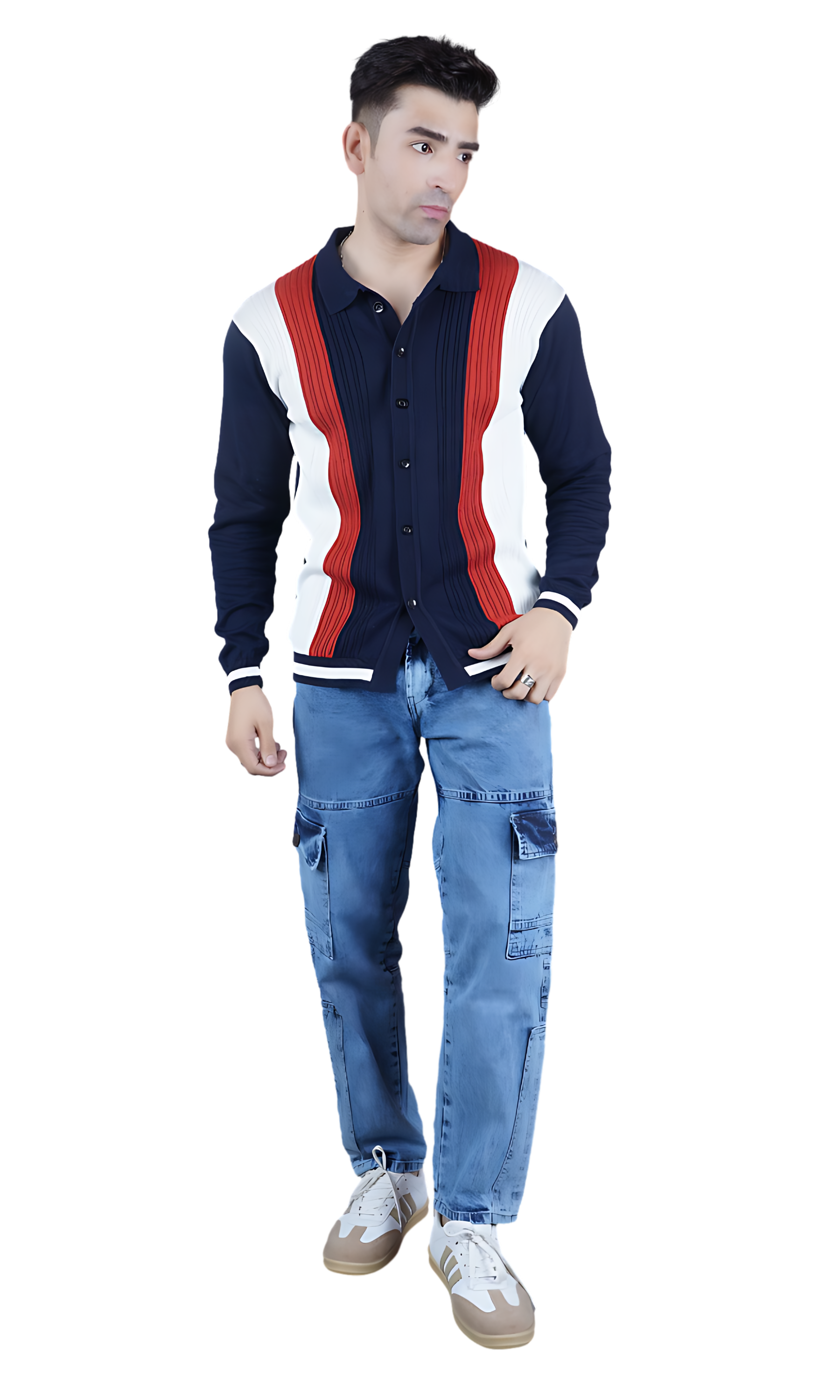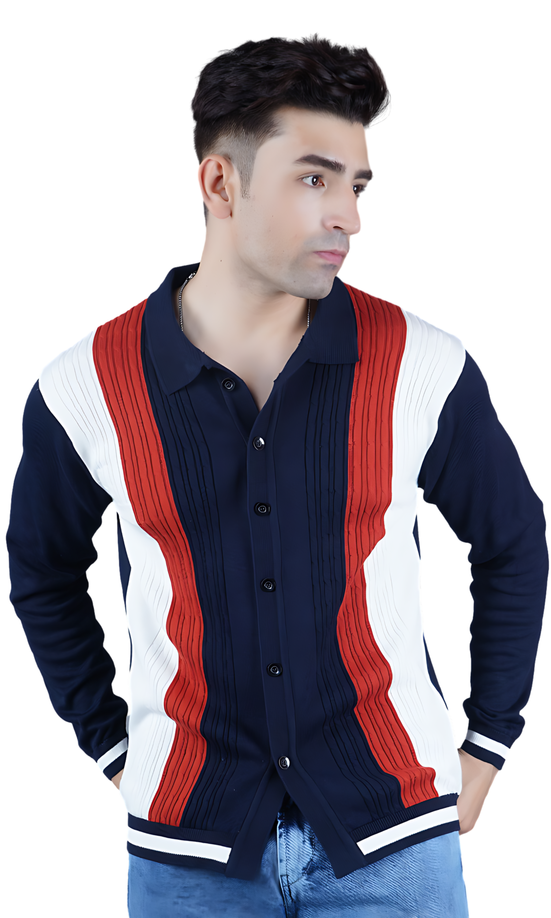 Elevate your wardrobe with the INFAXON Navy Blue and Stripes Knitted Shirt. Designed for versatility and comfort, this shirt is a must-have. Grab yours now and stay stylish!