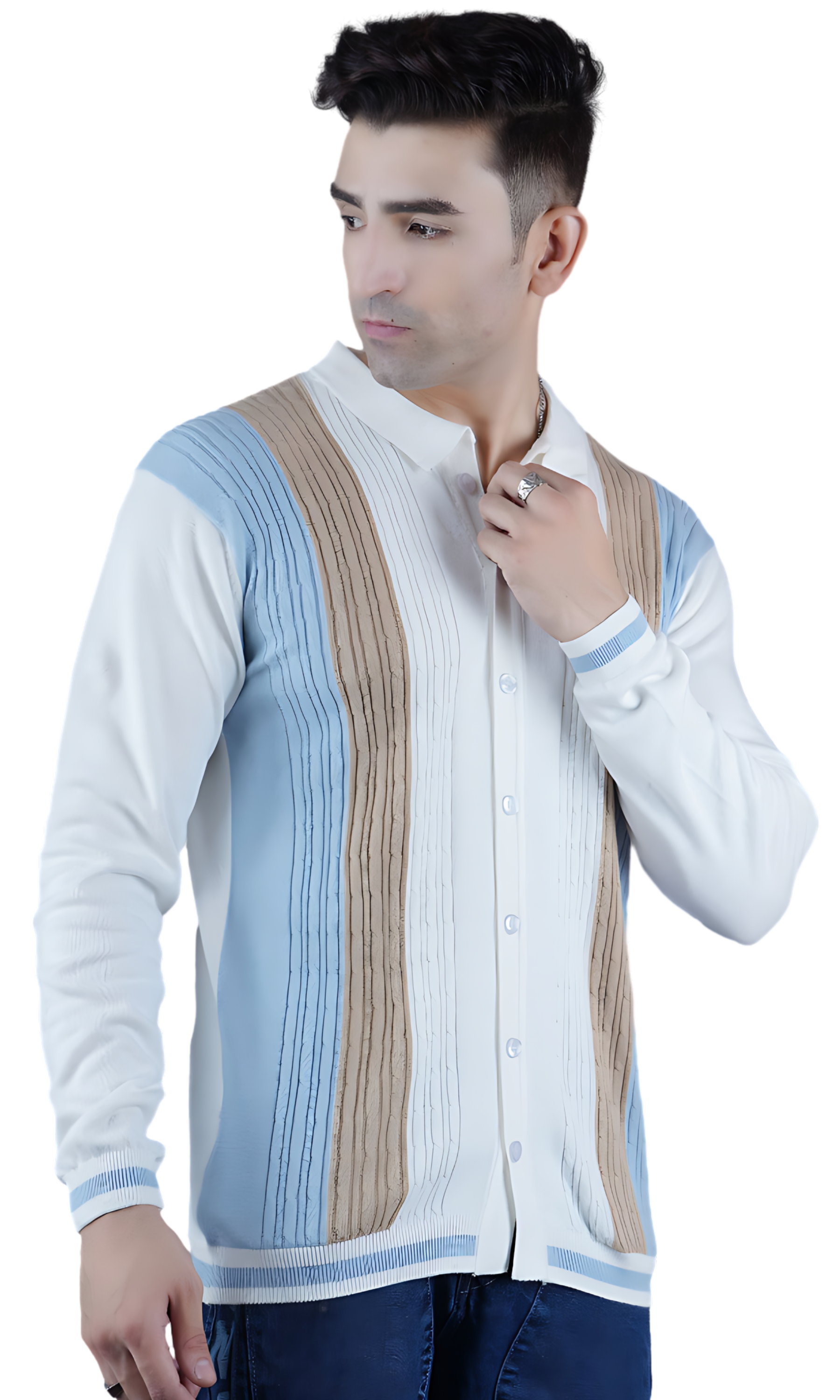The INFAXON Stripes on White Knitted Shirt combines a clean white base with bold stripes for a stylish, contemporary look. Made from soft, knitted fabric, this shirt provides a relaxed fit for comfort all day long. Lightweight and breathable, it’s perfect for casual wear or layering, offering both style and versatility.