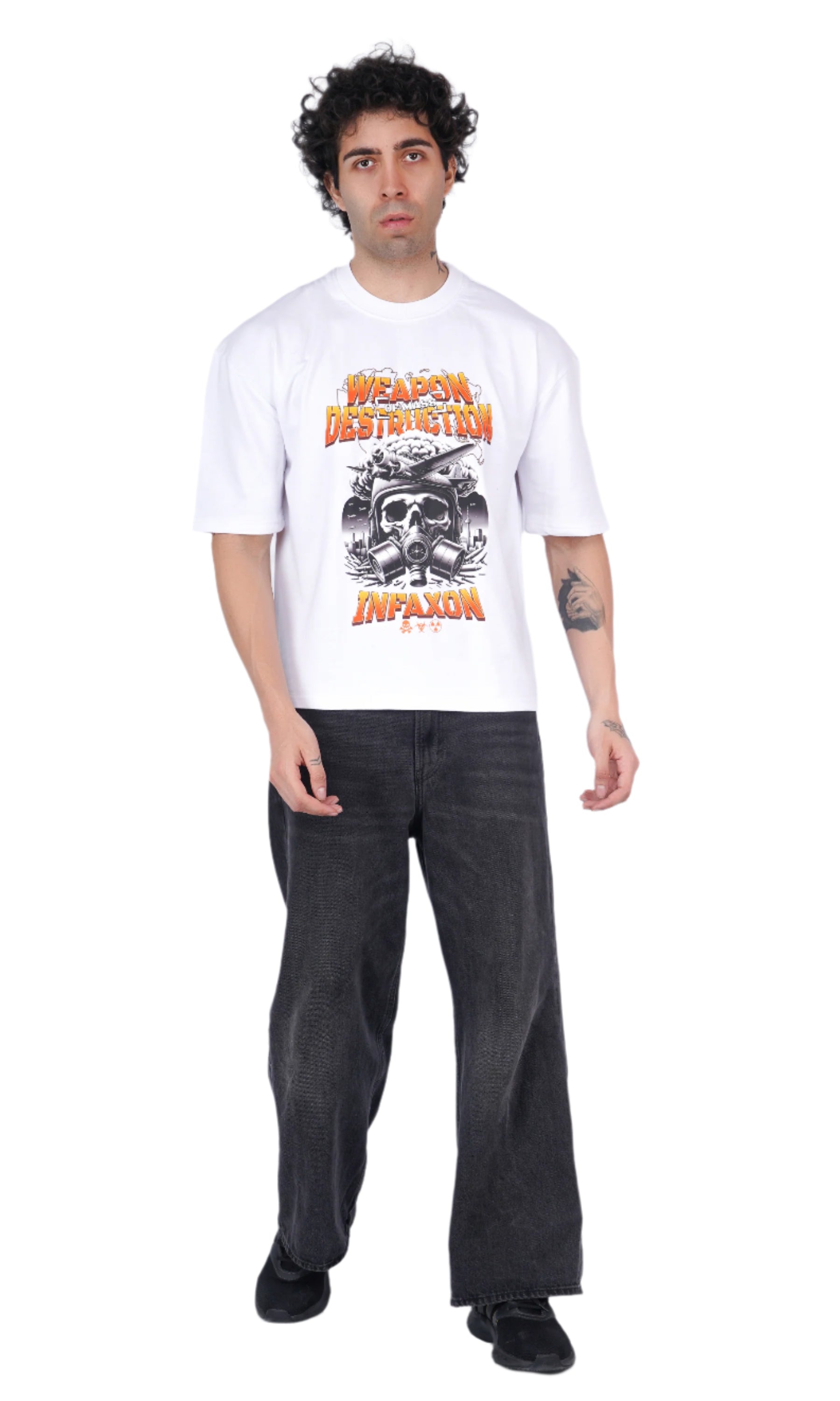 The INFAXON Weapon of Mass Destruction White Oversize T-shirt features a bold graphic that demands attention. Made from soft cotton, this relaxed-fit tee in classic white combines comfort with a striking design, perfect for making a statement while keeping your casual look fresh and effortless.