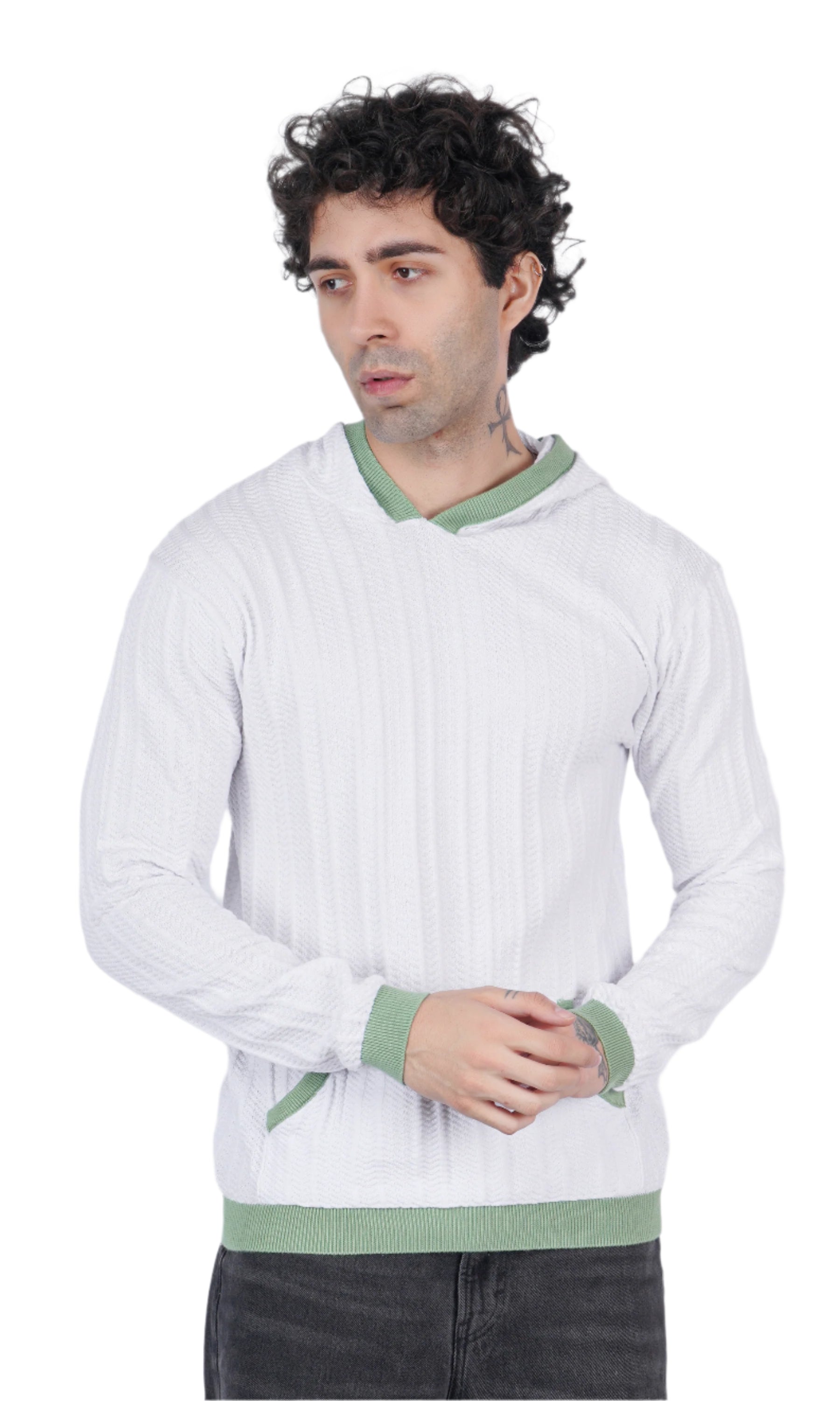 The INFAXON White and Pistachio Knitted Hoodie features a clean white base with pistachio accents. Made from soft knitted fabric, it offers a relaxed, oversized fit for comfort. Perfect for casual wear or layering.